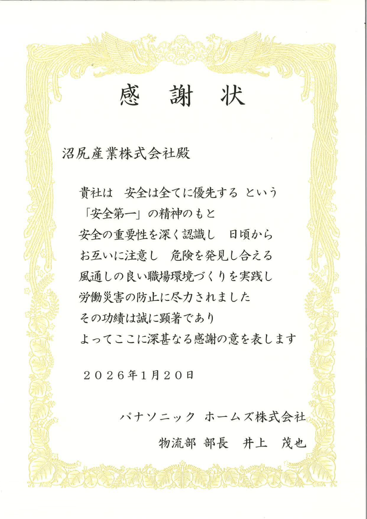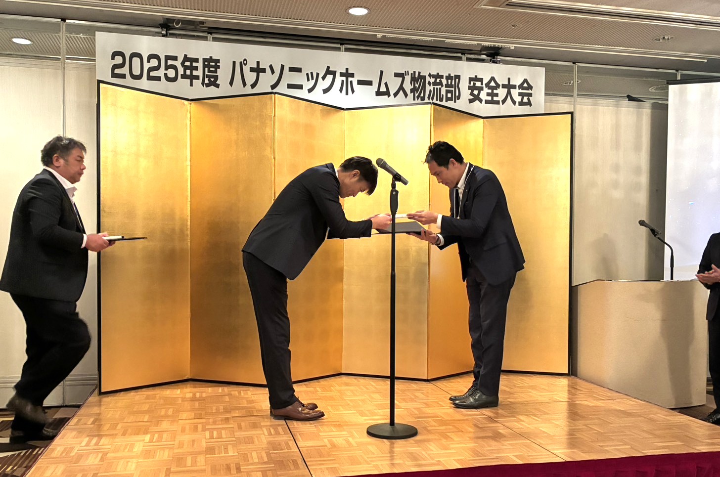 INFORMATION 2026.1.23 パナソニック ホームズ株式会社・物流部様の安全大会に参加し感謝状をいただきました。 1月20日(火)、パナソニック ホームズ株式会社・物流部様の安全大会にて、安全は全てに優先するという「安全第一」の精神を体現し、安全品質の向上に努める姿勢が評価され感謝状をいただきました。 また、当社の安全品質向上に対する取り組みを受賞者として発表いたしました。 今後も信頼される物流パートナーとして安全品質向上に努め、事故撲滅に向けて尽力してまいります。 - INFORMATION