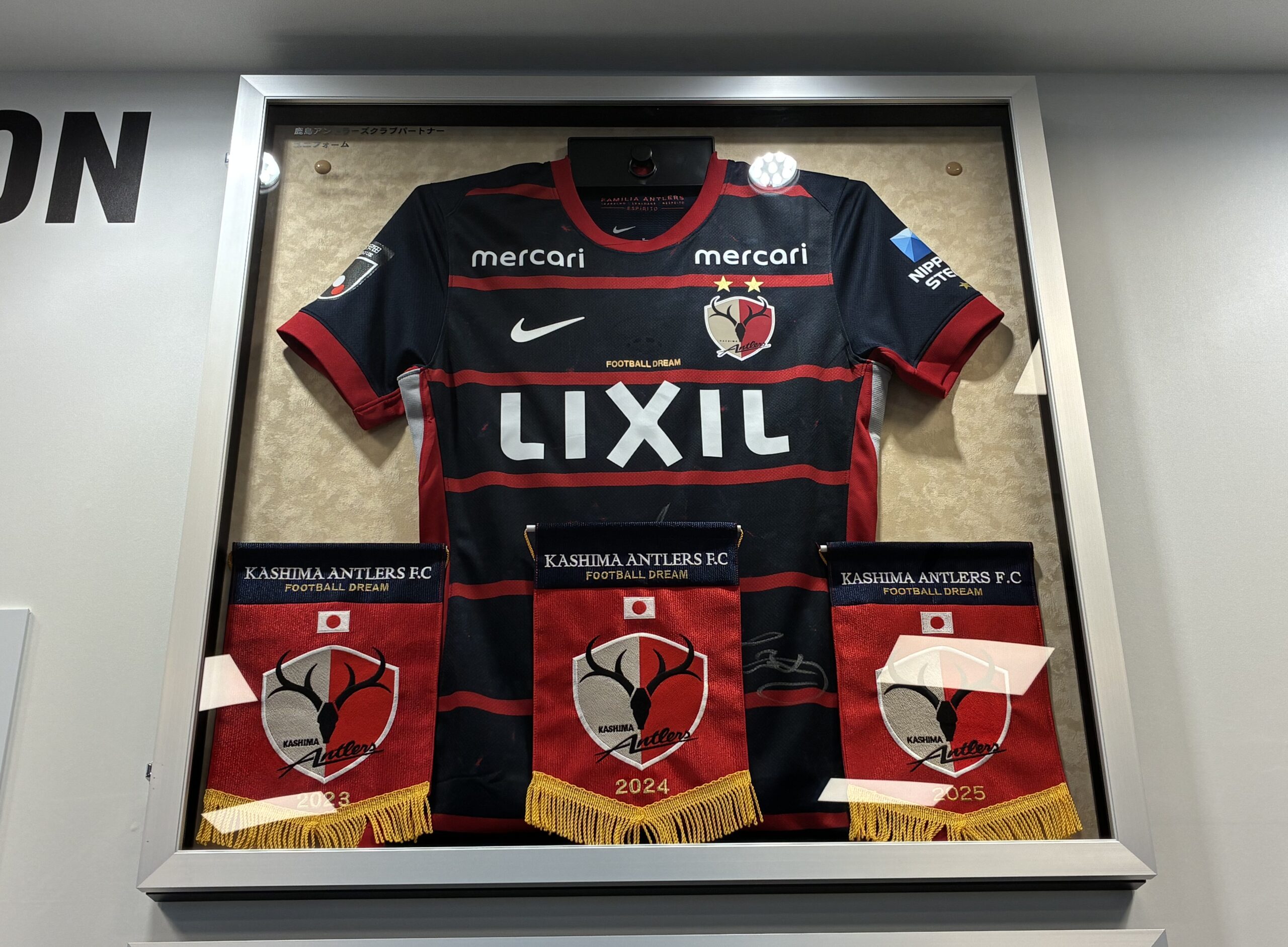 弊社がクラブパートナーを務める鹿島アントラーズの新ユニフォームを沼尻産業本社1階の歴史館スペースに飾らせていただきました!